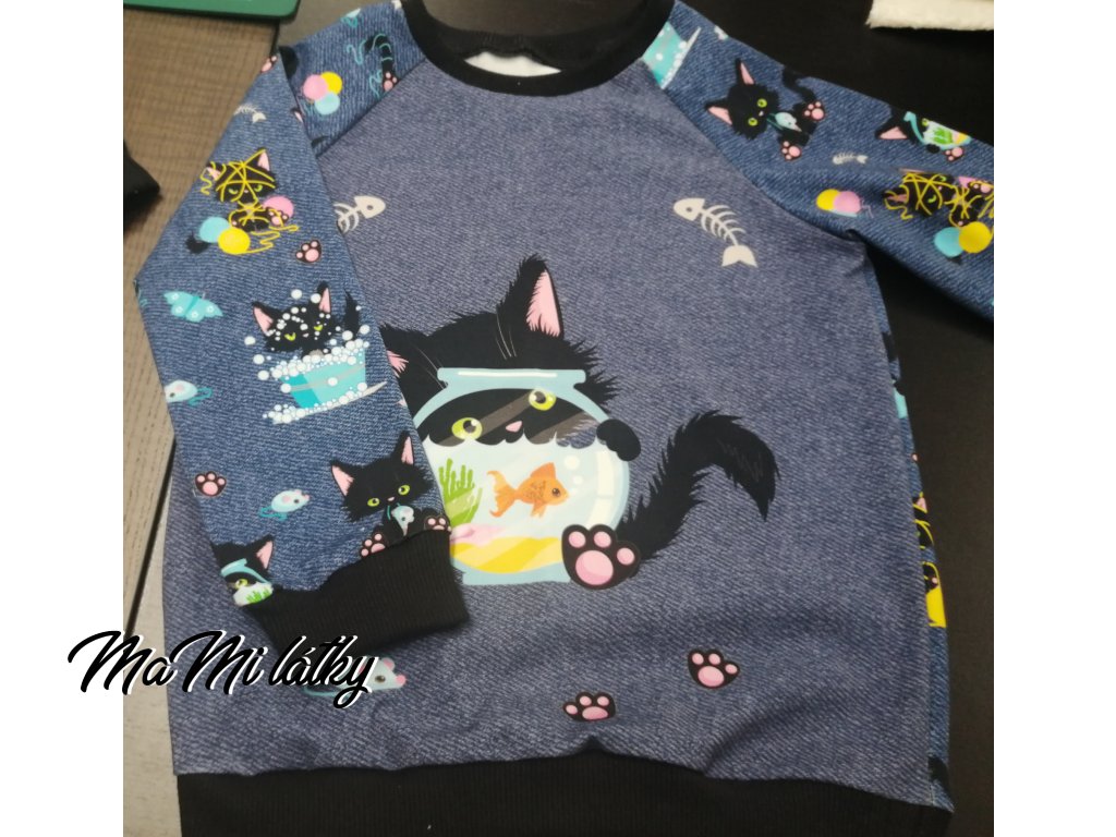 Baumwolljersey Panel Katze mit einem Fisch auf Jeans 40x50cm